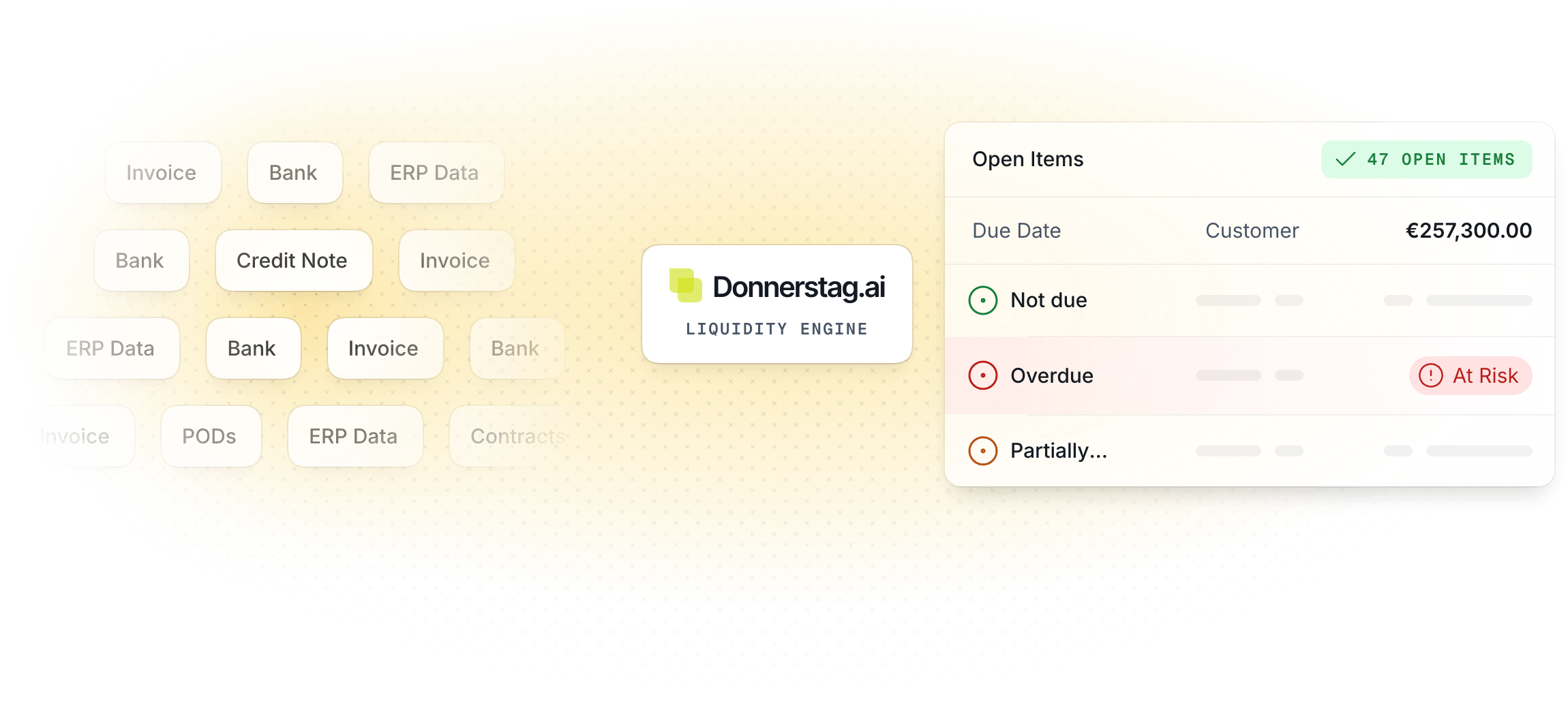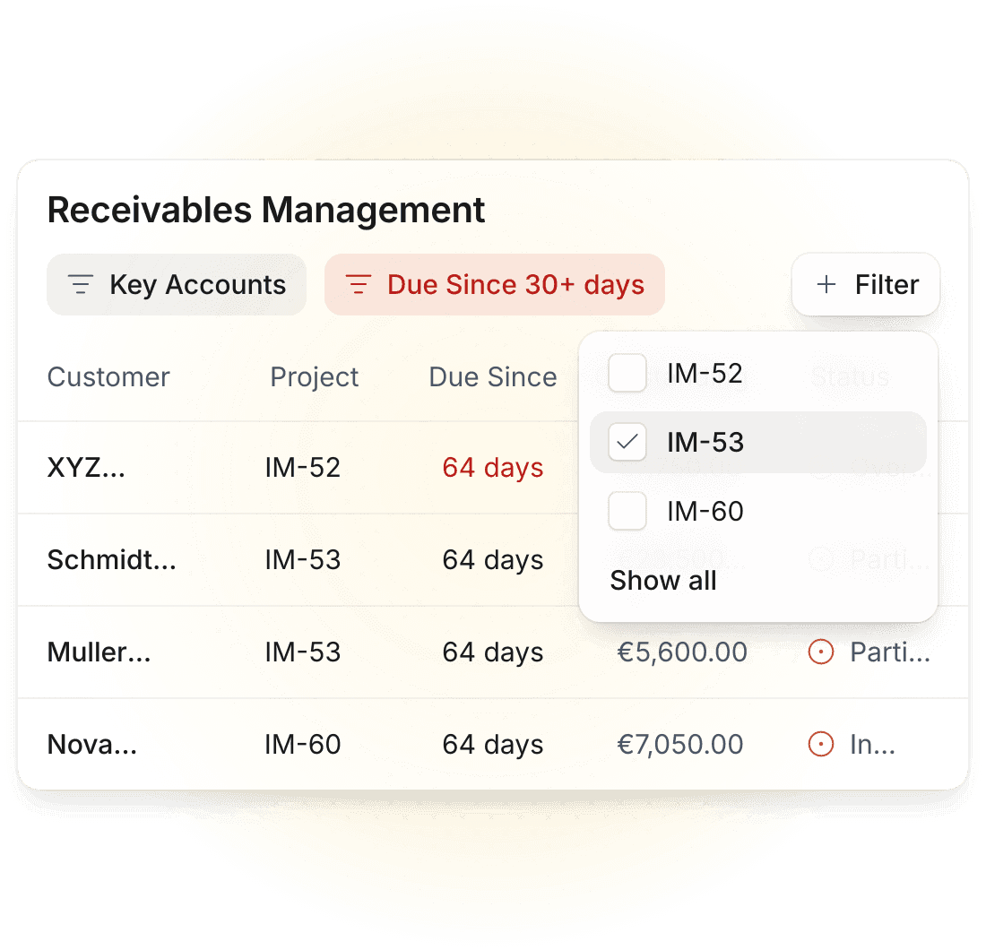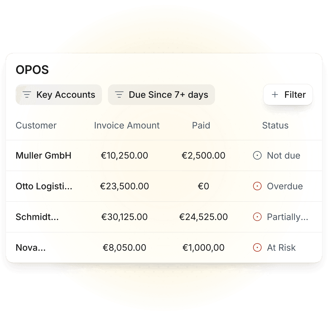 Ihre zentrale OPOS-Liste in Echtzeit. Überwachen Sie Fälligkeiten, steuern Sie Mahnstufen und prognostizieren Sie Ihren Cashflow ohne Excel-Listen und veraltete ERP-Reports.