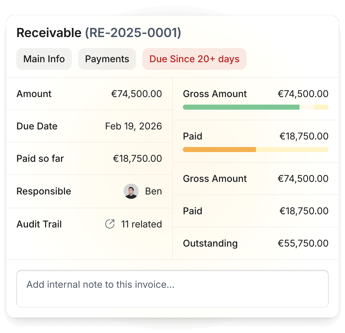 Ein Klick zeigt die ganze Wahrheit hinter jeder Rechnung — Zahlungen, Verantwortlichkeiten, verknüpfte Belege und das verbleibende Risiko.